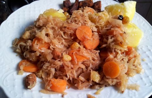 Zuurkool met wortel, aardappels, amandelen en blokjes gebakken tofu