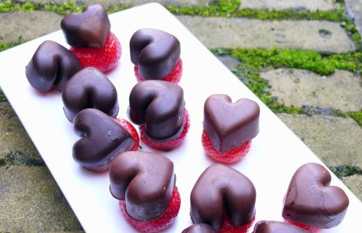 Do you ever food-google? I do it a lot, and sometimes I come across really nifty ideas. Like this one: a five-minute crowd pleaser... strawberry dipped in chocolate set in ice cube trays! Brilliant! I have a heart shaped one and used that.. look how pretty they turned out :)