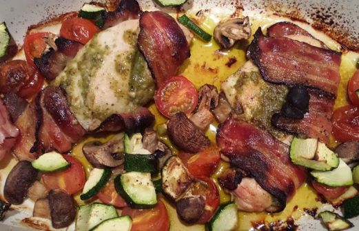 Ingrediënten voor 2 personen: - 2 kipfilets (liefst van de poelier) - 6 plakken katenspek (75 g) - 2 el groene pesto - 250 g cherry tomaatjes, doormidden - 250 g kastanje champignons, in stukjes - 1/4 courgette, in kleine blokjes - zout/peper - knoflookpoeder - olijfolie Bereiden: [...]