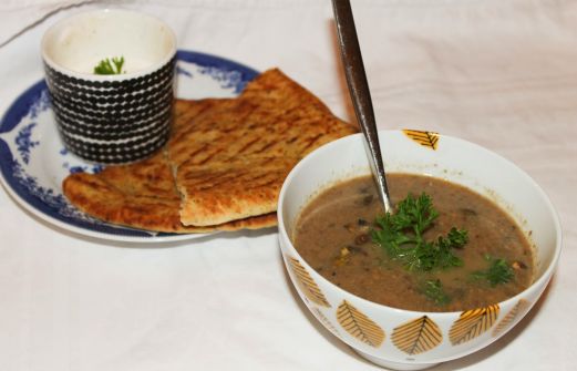 Verse paddenstoelensoep, heerlijk met naanbrood en een yoghurtdipsausje