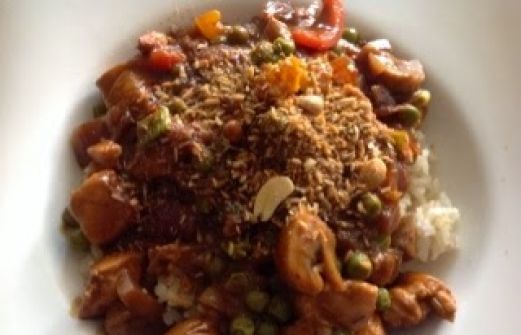 Ingrediënten (4personen) 400 gram kipfilet 5 eetl (zonnebloem)olie 3 grote gesnipperde uien 2 teentjes knoflook 1 rode peper (gesnipperd) 1 doosje champignons (plakjes) 2 paprika's (stukjes) Handje verse doperwten 1/4 liter bouillon (blokje) 2 eetl (keuken)azijn 9 eetl ketjap manis 4 eetl ketch [...]