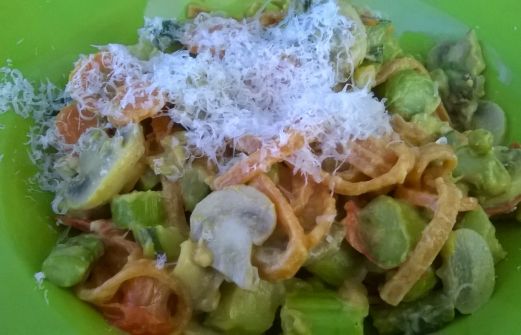 Scheutje olijfolie, handje kerstomaatjes, 1 middelmaat wortel geschild en in plakjes van 1 cm, 2 tenen knoflook, handje champignons in plakjes, 4 groene asperges, kontjes verwijden en in stukjes van 3 cm, 3 eetlepels doperwtjes (diepvries), 1/2 courgette in kwarten van 1 cm, hand [...]