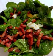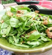 Sinds lange tijd hadden we weer eens een keer verse spinazie in plaats van diepvriesspinazie. Maar aangezien zo'n groot-ogende zak ontzettend slinkt als je het kookt, besloot ik er salade van te maken zodat er genoeg was voor iedereen.