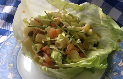 Het is erg leuk om soms wat nieuws te proberen. Zo maakte ik van de week deze salade voor Hans. Hij is dol op vis en ook kan ook erg genieten van een salade. Dus ik maakte een combinatie ;). Als presentatie gebruikte ik een blad ijsbergsla, dat is dan net een bakje.