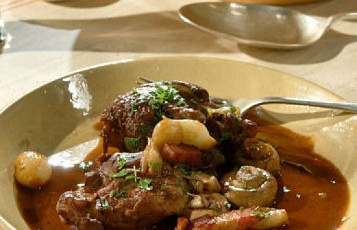 Het bestaat uit een in stukjes gesneden haan (of kip) met in vieren gesneden kleine champignons, diverse kruiden en klaargemaakt in een gebonden rodewijnsaus.