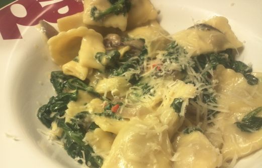 Deze ravioli maakte mijn zus toen ik bij haar at en hij was heerlijk! Het originele recept schreef knoflook voor, maar we kwamen er achter dat de knoflook op was. Ze gooide er een rode peper doorheen, wat een heerlijk pittig resultaat gaf.