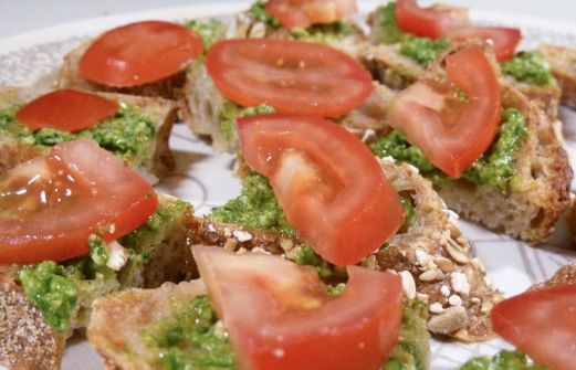 Meergranen stokbrood, bosje bascilicum, grote teen knoflook, citroensap, handje pijnboompitten, olijfolie, peper en zout, 1 grote pommodore to [...]