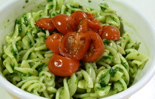 400 gram pasta naar keuze, 75 gram rucola, half bosje bascilicum (van een plantje), flinke teen knoflook, scheut citroensap, handje pompoen en zonnepitten, olijfolie, zout en peper, 2 bakjes kerstomaatjes, eetlepel bruine suiker, olijfolie.