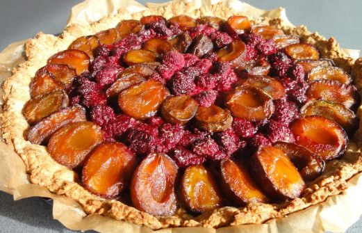 Begin mei was het tijd om al het fruit dat in de diepvriezer stak op te gebruiken. 700 g pruimen en 300 g frambozen vroegen om een pruimen-frambozentaart. Een echte deze keer: dat wil zeggen met deeg van granen dat gebakken moet worden.