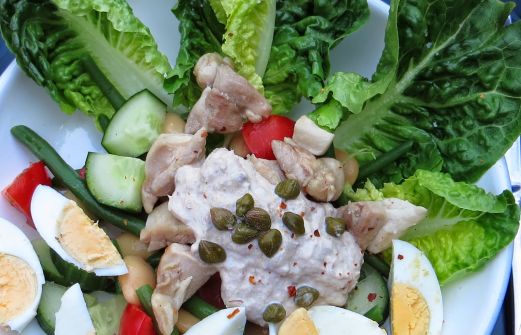 150 gram sperzieboontjes, 1 blik reuzenbonen, 400 gram blokjes kipdijfilet (gebakken), 1/2 komkommer, 250 gram kerstomaten, 3 el olfijolie, 2 el citroensap, zeezout, 1 krop romaine sla, 4 hardgekookte eieren, 2 bosuitjes, evt. wat olijven. Dressing [...]