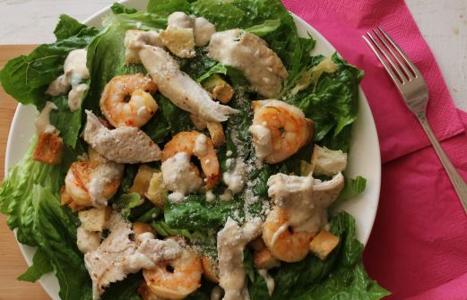 Deze ceasarsalade is een mengelmoesje van verschillende recepten, waardoor het een Surf&Turf is geworden. Vis en vlees in één salade.