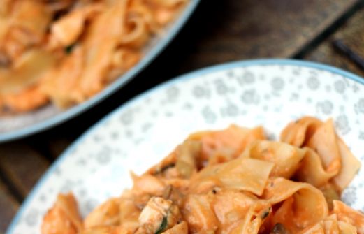 pasta met zalmsaus. Zoals je wellicht aan de ingrediënten kan zien, maak ik de