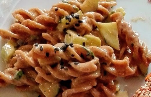 Meestal gebruik ik pesto als ik een pastasalade maak. In een tijdschrift zag ik een pastasalade met een dressing van pindakaas . Ik kon me er weinig bij voorstellen, dus daarom maar eens gemaakt.