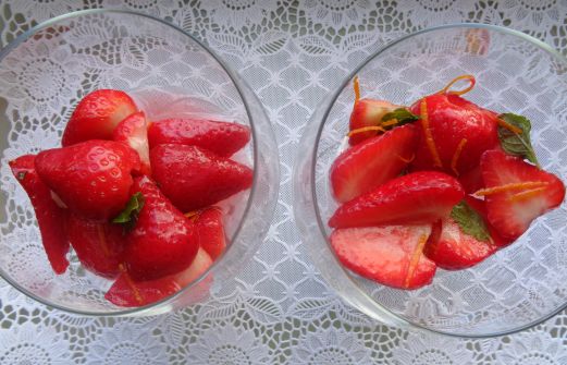 Erg lekker! Ingrediënten voor 3 personen: 500 g aardbeien 3 eetlepels suiker 3 eetlepels cointreau of, voordeliger, triple sec Een stukje sinaasappelschil Een paar muntblaadjes Bereiding: Was de aardbeien en verwijder de kroontjes. Snij ze doormidden en doe ze in een schaal Voeg de suiker, de C [...]