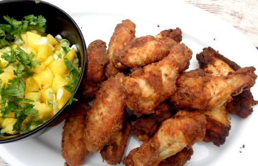 Een lekker borrelhapje of maaltijd met rijst en sugarsnaps Ingrediënten voor 4 pers. 1 eetlepel Thaise rode currypasta of 0.5 theelepel chilipoeder 1 limoen (sap) zonnebloemolie 1 kilogram kipkluifjes bloem voor de salsa 0.5 ananas (in kleine blokjes) 1 bosje koriander (grof gehakt) 2 lente-/bo [...]