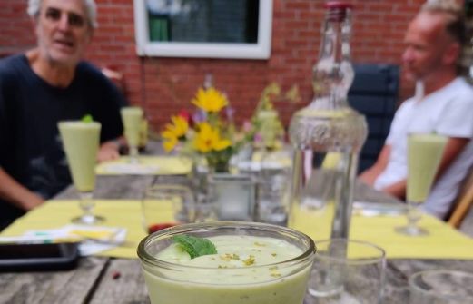 Eindelijk kunnen we eens de hele avond buiten blijven zitten. Wat een heerlijke gezellige avond! Het menu was: Komkommer-avocado-limoensmoothie Rillettes met zoetzure venkel, komkommer en dilledressing Lasagne Zomerbessentaart