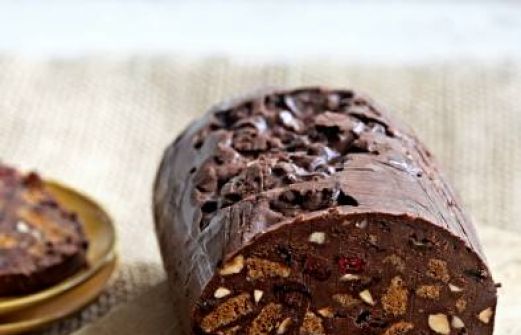 voor 15 personen 1 zakje thee 100 g gedroogde cranberries 100 g rozijnen 100 g blanke amandelen 200 ml slagroom 200 g chocolade (minimaal 70% cacao), in stukjes 125 g koude boter, in blokjes 180 g bastogne-koekjes, in stukjes gebroken 1 of 2 gedroogde rode pepers, heel fijngesneden [...]