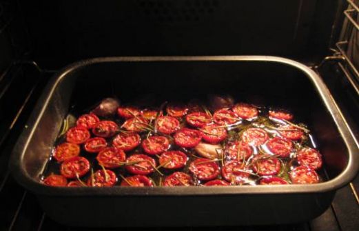 90 ml olijfolie, plus naar behoefte extra 6 teentjes knoflook, ongepeld en gekneusd met de platte kant van een mes of uw hand 500 g kerstomaatjes 2 theelepels poedersuiker Enkele takjes tijm of rozemarijn Zeezout en versgemalen zwarte peper Hulpmiddelen Oven, evt. glazen potj [...]