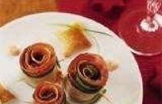 voor 4 personen 6 plakken gekookte achterham 6 plakken rauwe ham 1 komkommer honing-tijmsaus (flesje) 1 tomaat Hulpmiddelen Kaasschaaf cocktailprikkers Voorbereiding Snijd zes mooie plakken van de tomaat voor de garnering. Snijd 6 plakjejes van de komkommer voor de garneri [...]