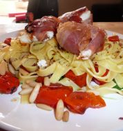 voor 2 personen - (volkoren)spaghetti voor 2 personen - 1 grote geroosterde paprika uit pot - 2 tomaten (ontveld en onthart) - halve courgette - 1 halve grote ui - 1 teen knoflook - halve spaanse peper zonder zaadlijst - helft van duobakje magere spekreepjes van de AH - eetlepel Ital [...]