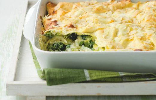 Ingrediënten 2 x 300 g broccoli (in kleine roosjes) 1 ui (gesnipperd) 3 el olijfolie 1 zakje bechamelsaus (pak 2 zakjes, besciamella) 500 ml melk 1 stukje Port Salut (50+ (kaas, 185 g)) 1 bakje amandelschaafsel (55 g) 1/2 pak lasagnevellen (a 375 g) [...]