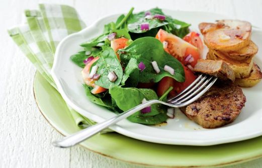 Ingrediënten 800 g aardappelen (pommonde fine (zak 2 1/2 kg)) 4 el olie 1 teen knoflook (grof gesneden) 1 schaal runder filetlapjes (gemarineerd a la minute (4 stuks, 300 g)) 1 zak panklare spinazie (300 g) 2 rode uien (fijngesnipperd) 350 g tomaten (in pa [...]