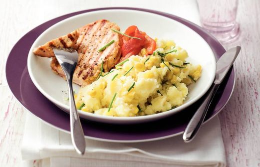 Ingrediënten 1 1/2 kg kruimige aardappelen (geschild en in stukken) 1 schaal filetlapjes (a la minute (400 g)) 2 eetlepels olijfolie 2 blikken maïskorrels ((3-pack, 3 x 198 g), uitgelekt) 1/2 bakje verse bieslook ((a 25 g), fijngesneden) 1/2 pot gegrilde papri [...]