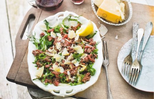 Ingrediënten 320 g kogelbiefstukken (Schaal à 320 g) 1 teen knoflook 1 citroen 3 el olijfolie 1 mespunt versgemalen zeezout 1 tl versgemalen zwarte peper (of meer naar smaak) 20 g rucola (pittig, zakje à 40 g) 40 g Parmezaanse kaas zet all [...]