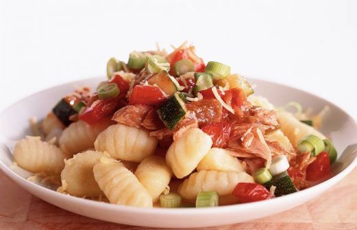 Ingrediënten 1 pak Gnocchi di patate (Italiaanse aardappelpureespecialiteit 500 g) 1 rode paprika 2 eetlepels olijfolie 1 blikje tonijn in olie (185 g) 2 blikken ratatouille niçoise (à 400 g) 3 bosuitjes 1 zakje gemalen belegen kaas (150 g) zet [...]