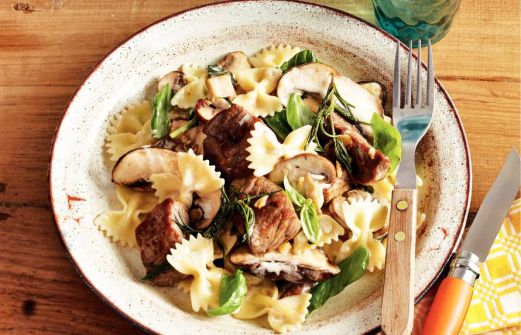 Ingrediënten 300 g farfalle (pasta, zak 500 g) 50 g boter 2 tenen knoflook (fijngesneden) 1 schaal biefstukpuntjes ((300 g), op kamertemperatuur) 3 takjes rozemarijn (naaldjes gerist) 1 bakje kastanjechampignons ((250 g), in plakjes) 1 schaal portobello (( [...]