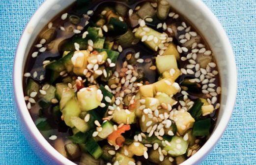 Ingrediënten ½ komkommer (in blokjes van ca. 1/2 cm) 1 el sesamzaad ((bakje 100 g), geroosterd) 1½ tl sojasaus (flesje 150 ml) zet alles op mijn lijst Handig als boodschappenlijstje of om online te bestellen Bereiden print Meng de komkommer met [...]