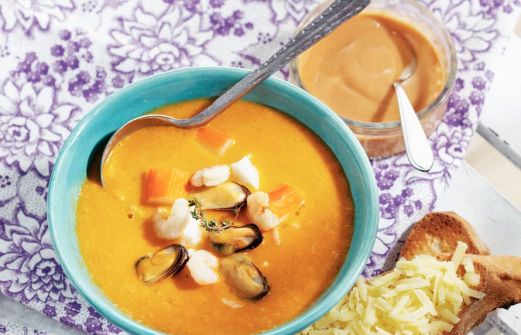 Ingrediënten 3 tenen knoflook 4 stengels bleekselderij 125 ml milde olijfolie 1 bakje tijm ((15 g), blaadjes gerist) 2 preien (gewassen en in ringen) 2 blikjes tomatenpuree (a 70 g) 1 zakje saffraan (0.05 g) 1 liter visbouillon ((van tablet), heet) [...]