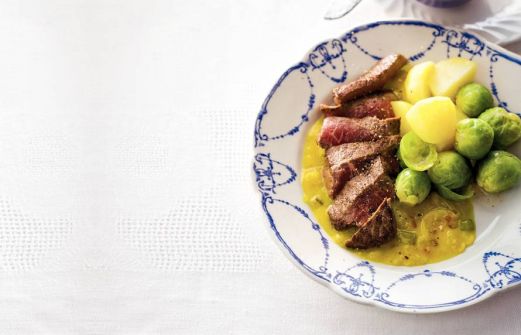 Ingrediënten 1 kg aardappelen (vastkokend) 2 x 250 g spruitjes (schoongemaakt (zak 350 gram)) 50 g boter 300 g biefstuk 1 ui (gesnipperd) 125 ml rundvleesbouillon (van tablet) 4 el piccalilly (potje 335 g) 1 mespunt nootmuskaat zet alles op [...]