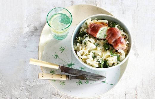 Ingrediënten 300 g pangasiusfilets 20 g platte peterselie 1 tl grove Zaanse mosterd 8 plakjes Coburger ham 6 el olie 300 g spinazie 1 ui 1 teen knoflook 300 g risottorijst 1.2 liter hete kippenbouillon (van tablet) 1 venkelknol 50 [...]