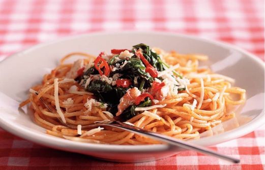 Ingrediënten 300 g spaghetti 2 teentjes knoflook 1 rode peper 2 eetlepels olijfolie 2 zakken panklare spinazie (a 300 g) 2 blikjes krab (naturel, a 170 g) 1 cup verse pastasaus napolitana (225 g) 4 eetlepels geraspte pittige kaas zet alles o [...]