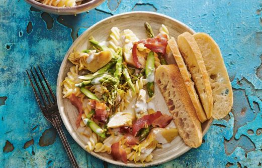 Ingrediënten 300 g fusilli 150 g ambachtelijk gerookt ontbijtspek 1 citroen (schoongeboend) 4 el aioli 350 g groene asperges 400 g artisjokharten (blik) zet alles op mijn lijst Handig als boodschappenlijstje of om online te bestellen Lekker erbij [...]