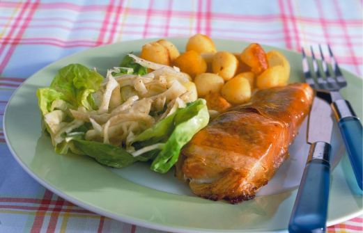 Ingrediënten 2 schaaltjes zalmfilets (a 2 stuks, ca. 200 g) 2 eetlepels citroensap 4 plakken rauwe ham 4 eetlepels zonnebloemolie 1 duopak krieltjes (700 g) 1 venkelknol 1 zak botersla (100 g) 6 eetlepels vinaigrette de dyon (fles a 500 ml) [...]