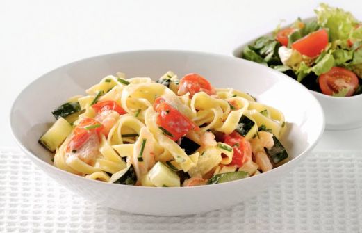 Ingrediënten 400 g tagliatelle (met ei Italiaans (zak a 500 g)) 1 beker slagroom (250 ml) 1 courgette 1 bakje cherrytomaten (250 g) 1 zakje verse bieslook (25 g) 1 blikje krab (stukken (170 g)) 1 zak gemengde sla (300 g) eetlepels sladressing balsamic [...]