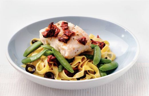 Ingrediënten 300 g tagliatelle (pasta) 1 doos kabeljauwfilet (diepvries, 400 g) 1 pot (semi-gedroogde) tomaten in olie met kruiden (320 ml) ½ pot zwarte olijven (in plakjes (a 240 g)) 1 doos suikerpeultjes (diepvries, 450 g) zet alles op mijn lijst [...]