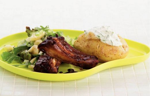 Ingrediënten 4 grote kruimige aardappels 3 stengels bleekselderij 1 appel 1 zak eikenbladslamelange (100 g) 4 eetlepels honing-mosterddressing (fles a 270 ml) 1 bekertje zure room (125 ml) 1/2 zakje verse bieslook (a 25 g) 1 schaal gegrilde spareribs [...]