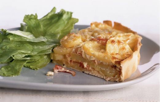 Ingrediënten 5 plakjes deeg voor hartige taart (diepvries, pakje a 450 g) 4 eieren (M) 1 kuipje roomkaas met kruiden (125 g) 200 g ham (knusperschinken, bedieningsafdeling) 1 zak aardappelgolfjes (450 g) 1 krop ijsbergsla 6 eetlepels sladressing naturel (f [...]