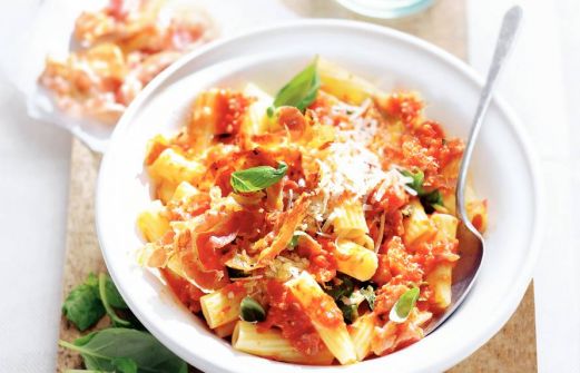Ingrediënten 300 g rigatoni (pasta, zak 500 g) 1 rode peper (zakje 2 stuks) 1 bakje cherrytomaten (250 g) 1 teen knoflook (gesneden) 3 el olijfolie extra vierge 1½ pakje pancetta (Italiaans spek, a 80 g) 1 bakje basilicum ((15 g), blaadjes gescheurd) [...]