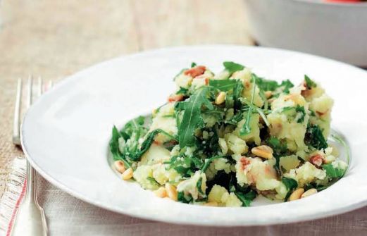 Ingrediënten 1 kg aardappels (iets kruimig) 250 g gerookte spekblokjes 1/2 bakje pijnboompitten (a 95 g) 2 el olie 2 zakken rucola (a 75 g) 2 pakken tomaten (6 grote, in parten) 1 takje verse munt (alleen de blaadjes) zet alles op mijn lijst Ha [...]