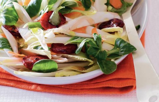 Ingrediënten 3 struiken witlof 1 kleine winterwortel (geschild) 1 zak veldsla (75 g) 6 eetlepels olijfolie 2 eetlepels witte wijnazijn 1 teentje knoflook (uitgeperst) ½ chorizoworst ((a 250 g), in dunne plakjes) zet alles op mijn lijst Han [...]