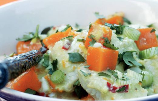 Ingrediënten 200 ml kokosmelk ½ rode peper (fijngehakt) 2 tl gemalen komijn (djinten) 2 tl kurkuma 3 tl verse gemb,erwortel (geraspt) 250 ml volle yoghurt 250 ml visbouillon (van tablet) 500 g pompoen (in blokjes) 600 g zeewolffilets (in gro [...]
