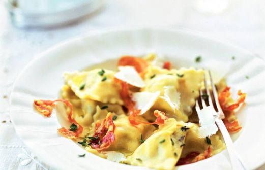 Ingrediënten 400 g bloem 5 eieren 2 eetlepels olijfolie extra vierge 300 g aardappels (kruimig geschild) 1 teentje knoflook (geperst) 100 g pecorino (kaas) (geraspt) 2 eetlepels verse tijm ((zakje a 15 g) fijngesneden) 100 g pancetta (Italiaanse bacon [...]