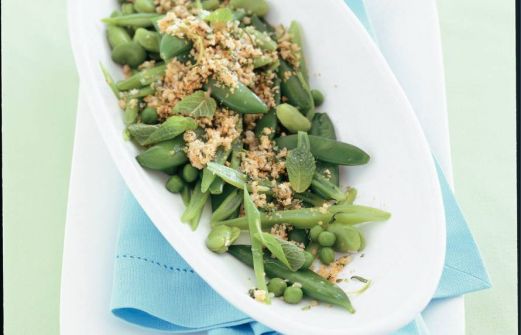 Ingrediënten ½ pak tuinbonen (diepvries, 450 g) 200 g snijbonen 200 g sugar snaps (of peultjes) 1 zakje doperwten (koelvers, 200 g) 2 sneetjes oud witbrood (ontkorst) 1 eetlepel olijfolie extra vierge met knoflook en chilipeper 1 zakje verse munt (15 [...]