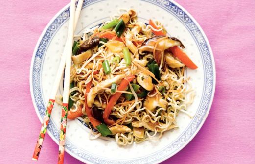 Ingrediënten 200 ml zonnebloemolie (+ 1 el) 500 g kipfilet (in reepjes) 3 el maizena (pakje 200 g) 1 rode paprika (in reepjes) 1 schaaltje shiitake (paddestoelen, 100 g) 1 pakje woknoedels (248 g) 5 cm verse gember ((zakje 150 g), geschild en in plakjes) [...]