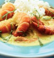 Ingrediënten 2 rode uien 2 teentjes knoflook 2 cm verse gemberwortel 2 bakjes cocktailgarnalen (a 125 g) ½ eetlepel milde currypasta (pot a 283 g) 2 eetlepels olie ½ theelepel gemalen kardemomfruit 2 eetlepels zure room ½ blikje ko [...]