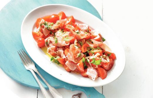 Ingrediënten 1 bak tasty tom tomaten (500 g) 1 bakje cherry tomaten (250 g) 1 bakje platte peterselie ((20 g), fijngesneden) 1 teen knoflook (geperst) 4 el olijfolie extra vierge 2 el citroensap zwarte peper (molen) 2 pakjes Campofrio Jamón Serrano ( [...]
